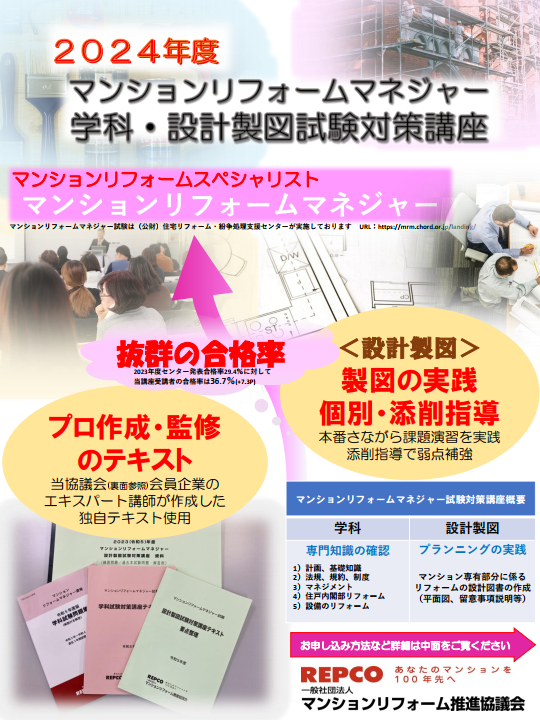 今年も2024年9月29日(日)にマンションリフォームマネジャー試験(公益財団法人住宅リフォーム・紛争処理支援センター主催)が実施予定です。
