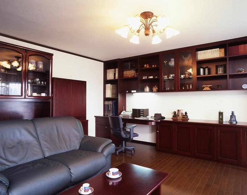 6畳の和室と5.5畳の和室をつなげリビングを新設。書斎コーナーとして、壁ぴったりの家具を組み込んだ。建具類は全て以前から愛用されていた飾り棚の色を基調に統一。